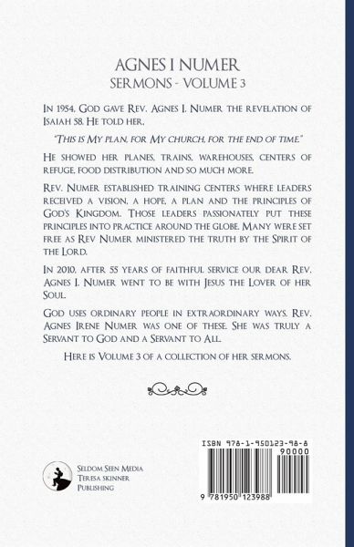 In 1954, God gave Rev. Agnes I. Numer the revelation of Isaiah 58. He told her, "This is My plan, for My church, for the end of time." He showed her planes, trains, warehouses, centers of refuge, food distribution and so much more. Rev. Numer established training centers where leaders received a vision, a hope, a plan and the principles of God's Kingdom. Those leaders passionately put these principles into practice around the globe. Many were set free as Rev Numer ministered the truth by the Spirit of the Lord. In 2010, after 55 years of faithful service our dear Rev. Agnes I. Numer went to be with Jesus the Lover of her Soul. God uses ordinary people in extraordinary ways. Rev. Agnes Irene Numer was one of these. She was truly a Servant to God and a Servant to All. Here is Volume 3 of a collection of her sermons.