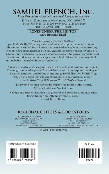 Agnes Under the Big Top: A Tall Tale explores the intersecting lives of several immigrants in a US city. It is a magical tale of hope and disappointment, identity and reinvention, narrated by an itinerant subway busker. Against the subterranean rhythms of a subway train, a Liberian home care worker, a former Bulgarian ringmaster and his wife, an Indian call center escapee, and a bed-ridden American woman, find and redefine themselves in today's America.