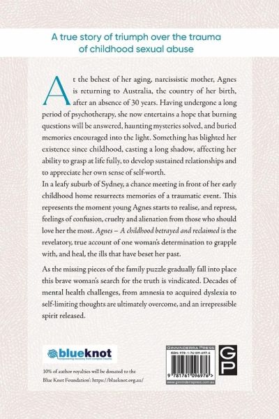 After a 30-year absence Agnes is returning to Australia, the country of her birth, at the request of her aging, narcissistic mother. Having undergone a long period of psychotherapy she now entertains a hope that burning questions will be answered, haunting mysteries solved, and buried memories encouraged into the light. Something has blighted her life since childhood. Something has cast a long shadow over her existence, affecting her ability to grasp at life fully, to develop sustained relationships and to appreciate her own sense of self-worth.In a leafy suburb of Sydney, a chance meeting in front of her early childhood home resurrects memories of a traumatic event. This represents the moment young Agnes starts to realise, and repress, feelings of confusion, cruelty and alienation from those who should love her the most. Agnes - A childhood betrayed and reclaimed is the revelatory, true account of one woman's determination to grapple with - and heal - the ills that have beset her past. As the missing pieces of the family puzzle gradually fall into place this brave woman's search for the truth is vindicated. Decades of mental health challenges, from amnesia to acquired dyslexia to self-limiting thoughts are ultimately overcome, and an irrepressible spirit released