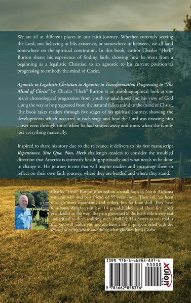 We are all at different places in our faith journey. Whether currently serving the Lord, not believing in His existence, or somewhere in between, we all land somewhere on the spiritual continuum. In this book, author Charles "Herb" Burton shares his experience of finding faith, showing how he went from a beginning as a legalistic Christian to an agnostic to his current position as progressing to embody the mind of Christ. Agnostic to Legalistic Christian to Agnostic to Transformation Progressing to "The Mind of Christ" by Charles "Herb" Burton is an autobiographical look at one man's chronological progression from youth to adulthood and his view of God along the way as he progressed from the natural fallen mind to the mind of Christ. The book takes readers through five stages of his spiritual journey, showing the developments which occurred at each stage and how the Lord was drawing him closer even through times when he had strayed away and times when the family lost everything materially. Inspired to share his story due to the relevance it delivers to his first manuscript Repentance, Sine Qua, Non, Herb challenges readers to consider the troubled direction that America is currently heading spiritually and what needs to be done to change it. His journey is one that will inspire readers and encourage them to reflect on their own faith journey, where they are headed and where they stand. Charles "Herb" Burton is retired on a small farm in North Alabama with his wife and best friend of 55 years Joyce. Their life has been through many mountains and valleys, but far from dull. They have four sons, daughters-in-law, 14 grandchildren and their first great grandchild on the way. The path presented in the book title is very real and critical to them realizing such a full life. His prayer as you read is that you will realize you too can have a life of purpose filled with the reward of being where and doing what glorifies Jesus Christ.