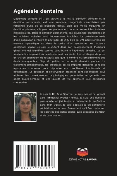 L'agénésie dentaire (AT), qui touche à la fois la dentition primaire et la dentition permanente, est une anomalie congénitale caractérisée par l'absence d'une ou de plusieurs dents. Bien que moins fréquente en dentition primaire, elle peut se produire et concerne souvent les incisives mandibulaires. Dans la dentition permanente, les deuxièmes prémolaires et les incisives latérales sont fréquemment touchées. La prévalence varie d'une population à l'autre et peut aller de 2 % à 10 %. L'AT peut survenir de manière sporadique ou dans le cadre d'un syndrome, les facteurs génétiques jouant un rôle important dans son développement. Plusieurs gènes ont été identifiés comme contribuant à l'agénésie dentaire, ce qui souligne la complexité du développement des dents. Les stratégies de prise en charge dépendent de facteurs tels que le nombre et l'emplacement des dents manquantes, l'âge du patient et la santé dentaire globale. Le traitement orthodontique, les prothèses ou les implants dentaires sont des approches courantes pour répondre aux problèmes fonctionnels et esthétiques. La détection et l'intervention précoces sont essentielles pour atténuer les conséquences psychologiques potentielles et garantir une santé bucco-dentaire et une qualité de vie optimales aux personnes concernées.