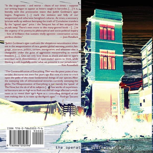 Poetry. Literary Nonfiction. Hybrid Genre. "In the tragi-comic--and worse--chaos of our times--suppose our writing began to appear as letters caught in barcodes. Phrases and bits of words breaking off en route to scanners designed for registering information but not the disturbance of meaning. It is, literally, with this provocative vision that Judith Goldman's AGON begins. Fragments--words with ing or ite or ppeals detached--mark the violence and folly of our weaponized and otherwise benighted cultures. At times, a necessary lyricism wells up without betraying the truth of 'Cumulative transfers By the 'agreed upon' price / the Temp,est has of late stripped the pe,tals away.' There's even more to this many-genred book--one to be lived with, in the urgency of its poetry, its philosophical and socio-political inquiry--font of brilliance that sustains vitally agonistic conversation across perilous divides."--Joan Retallack "The Commodification of Everything. That was the pivot point of materialist discourse not even five years ago. But now, it's time to crack open the piths of the most fundamental doings of our species. After the sweeping tide of ethnonational victories currently sweeping the globe, The Weaponization of Everything, is not merely the 'speak' of The Now, but the do of all its subjects, whether collusive or rebellious. Judith Goldman's AGON is borne amidst this new reality. Few works of experimental literature aim so high as to flush out the full range affectual coordinates as to reveal their age's Agon as a controlling demigod of our own making, that is, to raise up the Agon's 'agon'."--Rodrigo Toscano "Judith Goldman's AGON confronts the ubiquitous naturalization inherent in the weaponization of race, gender, global warming, poetics, language, utterance, politics, torture, immigr