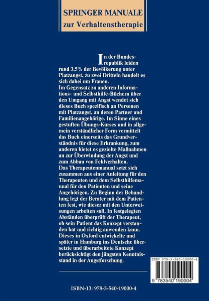 In der Bundesrepublik leiden rund 3,5 % der Bevölkerung unter Platzangst, zu zwei Dritteln handelt es sich dabei um Frauen. Im Gegensatz zu anderen Informations- und Selbsthilfe-Büchern über den Umgang mit Angst wendet sich dieses Buch spezifisch an Personen mit Platzangst, an deren Partner und Familienangehörige. Im Sinne eines gestuften Übungs-Kurses und in allgemeinverständlicher Form vermittelt das Buch einerseits das Grundverständnis für diese Erkrankung, zum anderen bietet es gezielte Maßnahmen an zur Überwindung der Angst und zum Abbau von Fehlverhalten. Das Therapeutenmanual setzt sich zusammen aus einer Anleitung für den Therapeuten und dem Selbsthilfemanual für den Patienten. Zu Beginn der Behandlung legt der Berater mit dem Patienten fest, wie dieser mit den Unterweisungen arbeiten soll. In bestimmten zeitlichen Abständen überprüft der Therapeut, ob sein Patient das Konzept verstanden hat und richtig anwenden kann. Dieses in Oxford entwickelte und später in Hamburg insDeutsche übersetzte und überarbeitete Konzept berücksichtigt den jüngsten Kenntnisstand in der Angstforschung.