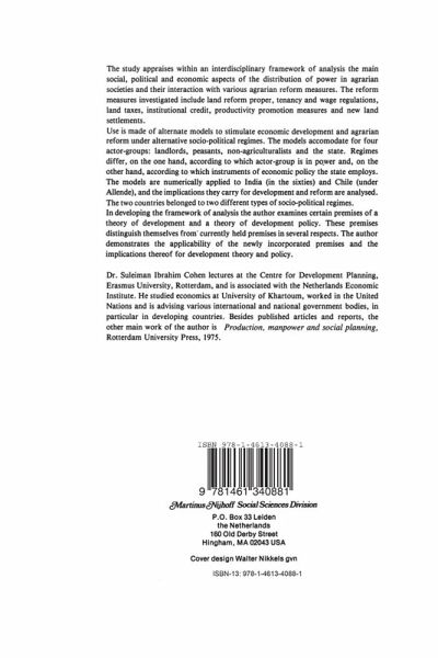 This study is an attempt to contribute to our understanding of one of the most important reforms currently advocated by development economists to reduce rural poverty in developing countries: land reform. Dr. Cohen has based his study on models in which three social groups are acting: these, for brevity's sake, are called land lords, peasants and the groups who comprise the non-agricultural sector. Peasants include the so-called landless peasants which western countries generally term agrarian workers. The method can be extended to larger numbers of groups. The actors are involved in various activities, including production, consumption and saving, the latter being available either for physical or for financial invest ment. This implies that various wealth components appear in the model alongside flows of goods and services. Use is made of determinate models with linear and non-linear equations of a dynamic character. The models are employed to estimate socio-economic developmentunder alternative regimes. Regimes differ, on the one hand, according to which group is in power and, on the other hand, according to the instruments of economic policy they use. It is an attractive feature of Dr. Cohen's study that the models are applied to two countries for which all the necessary statistical material has been estimated: India and Chile. For both countries a brief socio-political sketch precedes the numerical application of the models. For India five instruments of socio-economic policy are considered: land transfers, measures to stimulate productivity, credit policies, taxes and tenure and wage regulations.