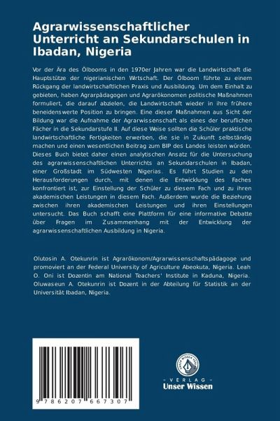 Vor der Ära des Ölbooms in den 1970er Jahren war die Landwirtschaft die Hauptstütze der nigerianischen Wirtschaft. Der Ölboom führte zu einem Rückgang der landwirtschaftlichen Praxis und Ausbildung. Um dem Einhalt zu gebieten, haben Agrarpädagogen und Agrarökonomen politische Maßnahmen formuliert, die darauf abzielen, die Landwirtschaft wieder in ihre frühere beneidenswerte Position zu bringen. Eine dieser Maßnahmen aus Sicht der Bildung war die Aufnahme der Agrarwissenschaft als eines der beruflichen Fächer in die Sekundarstufe II. Auf diese Weise sollten die Schüler praktische landwirtschaftliche Fertigkeiten erwerben, die sie in Zukunft selbständig machen und einen wesentlichen Beitrag zum BIP des Landes leisten würden. Dieses Buch bietet daher einen analytischen Ansatz für die Untersuchung des agrarwissenschaftlichen Unterrichts an Sekundarschulen in Ibadan, einer Großstadt im Südwesten Nigerias. Es führt Studien zu den Herausforderungen durch, mit denen die Entwicklung des Faches konfrontiert ist, zur Einstellung der Schüler zu diesem Fach und zu ihren akademischen Leistungen in diesem Fach. Außerdem wurde die Beziehung zwischen ihren akademischen Leistungen und ihren Einstellungen untersucht. Das Buch schafft eine Plattform für eine informative Debatte über Fragen im Zusammenhang mit der Entwicklung der agrarwissenschaftlichen Ausbildung in Nigeria.