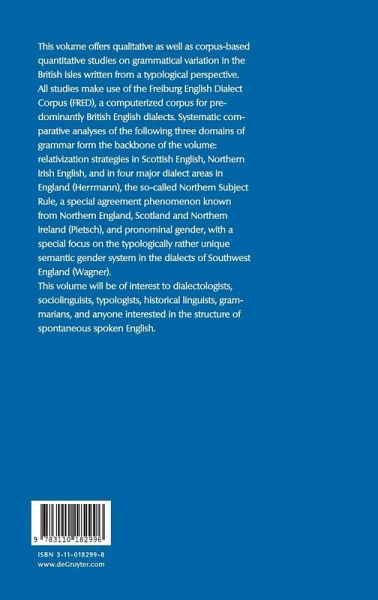 Tanja Herrmann's study is the first systematic cross-regional study of relativization strategies for Scotland, Northern Ireland, and four major dialect areas in England. In her research design Hermann has included a number of issues crucial in typological research on relative clauses, above all the Noun Phrase Accessibility Hierarchy. Lukas Pietsch investigates the so-called Northern Subject Rule, a special agreement phenomenon known from Northern England, Scotland and Northern Ireland. His study is primarily based on the Northern Ireland Transcribed Corpus of Speech, but also on the FRED and SED data (Survey of English Dialects) for the North of England. Susanne Wagner is concerned with the phenomenon of pronominal gender, focussing especially on the typologically rather unique semantic gender system in the dialects of Southwest England.