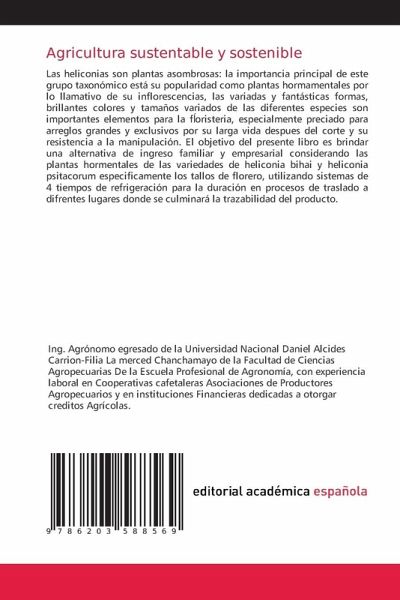 Las heliconias son plantas asombrosas: la importancia principal de este grupo taxonómico está su popularidad como plantas hormamentales por lo llamativo de su inflorescencias, las variadas y fantásticas formas, brillantes colores y tamaños variados de las diferentes especies son importantes elementos para la f¿oristeria, especialmente preciado para arreglos grandes y exclusivos por su larga vida despues del corte y su resistencia a la manipulación. El objetivo del presente libro es brindar una alternativa de ingreso familiar y empresarial considerando las plantas hormentales de las variedades de heliconia bihai y heliconia psitacorum especificamente los tallos de florero, utilizando sistemas de 4 tiempos de refrigeración para la duración en procesos de traslado a difrentes lugares donde se culminará la trazabilidad del producto. Las heliconias son plantas asombrosas: la importancia principal de este grupo taxonómico está su popularidad como plantas hormamentales por lo llamativo de su inflorescencias, las variadas y fantásticas formas, brillantes colores y tamaños variados de las diferentes especies son importantes elementos para la f¿oristeria, especialmente preciado para arreglos grandes y exclusivos por su larga vida despues del corte y su resistencia a la manipulación. El objetivo del presente libro es brindar una alternativa de ingreso familiar y empresarial considerando las plantas hormentales de las variedades de heliconia bihai y heliconia psitacorum especificamente los tallos de florero, utilizando sistemas de 4 tiempos de refrigeración para la duración en procesos de traslado a difrentes lugares donde se culminará la trazabilidad del producto.