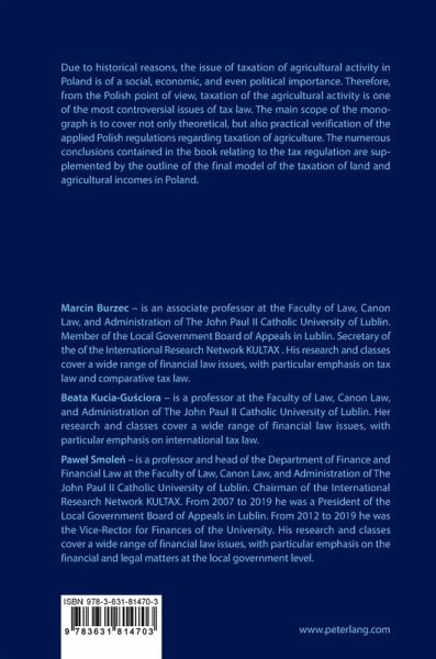 Due to historical reasons, the issue of taxation of agricultural activity in Poland is of a social, economic, and even political importance. Therefore, from the Polish point of view, taxation of the agricultural activity is one of the most controversial issues of tax law. The main scope of the monograph is to cover not only theoretical, but also practical verification of the applied Polish regulations regarding taxation of agriculture. The numerous conclusions contained in the book relating to the tax regulation are supplemented by the outline of the final model of the taxation of land and agricultural incomes in Poland.