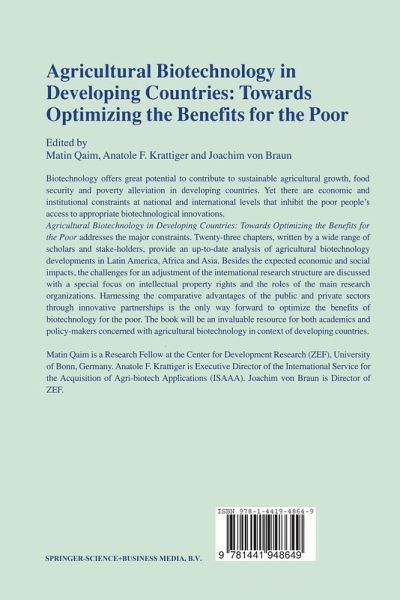 Biotechnology offers great potential to contribute to sustainable agricultural growth, food security and poverty alleviation in developing countries. Yet there are economic and institutional constraints at national and international levels that inhibit the poor people's access to appropriate biotechnological innovations. Agricultural Biotechnology in Developing Countries: Towards Optimizing the Benefits for the Poor addresses the major constraints. Twenty-three chapters, written by a wide range of scholars and stake-holders, provide an up-to-date analysis of agricultural biotechnology developments in Latin America, Africa and Asia. Besides the expected economic and social impacts, the challenges for an adjustment of the international research structure are discussed, with a special focus on intellectual property rights and the roles of the main research organizations. Harnessing the comparative advantages of the public and private sectors through innovative partnerships is the only way forward to optimize the benefits of biotechnology for the poor. The book will be an invaluable resource for both academics and policy-makers concerned with agricultural biotechnology in context of developing-countries.