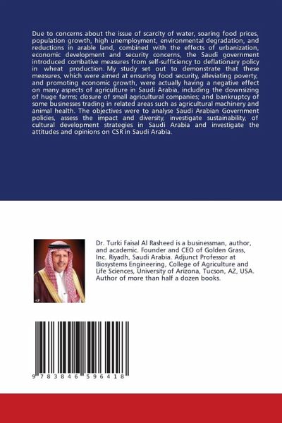 Due to concerns about the issue of scarcity of water, soaring food prices, population growth, high unemployment, environmental degradation, and reductions in arable land, combined with the effects of urbanization, economic development and security concerns, the Saudi government introduced combative measures from self-sufficiency to deflationary policy in wheat production. My study set out to demonstrate that these measures, which were aimed at ensuring food security, alleviating poverty, and promoting economic growth, were actually having a negative effect on many aspects of agriculture in Saudi Arabia, including the downsizing of huge farms; closure of small agricultural companies; and bankruptcy of some businesses trading in related areas such as agricultural machinery and animal health. The objectives were to analyse Saudi Arabian Government policies, assess the impact and diversity, investigate sustainability, of cultural development strategies in Saudi Arabia and investigatethe attitudes and opinions on CSR in Saudi Arabia.