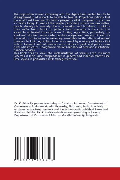 The population is ever increasing and the Agricultural Sector has to be strengthened in all respects to be able to feed all. Projections indicate that our world will have over 9.9 billion people by 2050, compared to just over 7.7 billion today. To feed all the people, particularly when over nine million people already die annually due to starvation and hundreds of millions more suffer from chronic or periodic food insecurity, is the crisis that should be addressed instantly on war footing. Agriculture, particularly, the small and mid-sized farmers who produce a significant amount of food for the world, continues to be extremely vulnerable to the effects of natural disasters. In India, agricultural risks are caused by a variety of factors that include frequent natural disasters, uncertainties in yields and prices, weak rural infrastructure, unorganised markets and lack of access to institutional financial services. This book tries to look into implementation of various Crop Insurance Schemes in India since independence in general and Pradhan Mantri Fasal Bima Yojana in particular as risk management tool.