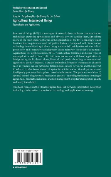 Internet of things (IoT) is a new type of network that combines communication technology, expanded applications, and physical devices. Among them, agriculture is one of the most important areas in the application of the IoT technology, which has its unique requirements and integration features. Compared to the information technology in traditional agriculture, the agricultural IoT mainly refers to industrialized production and sustainable development under relatively controllable conditions. Agricultural IoT applies sensors, RFID, visual capture terminals and other types of sensing devices to detect and collect site information, and with broad applications in field planting, facility horticulture, livestock and poultry breeding, aquaculture and agricultural product logistics. It utilizes multiple information transmission channels such as wireless sensor networks, telecommunications networks and the internet to achieve reliable transmission of agricultural information at multiple scales and intelligently processes the acquired, massive information. The goals are to achieve (i) optimal control of agricultural production process, (ii) intelligent electronic trading of agricultural products circulation, and (iii) management of systematic logistics, quality and safety traceability. This book focuses on three levels of agricultural IoT network: information perception technology, information transmission technology and application technology.
