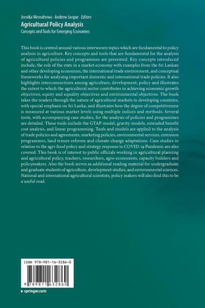 This book is centred around various interwoven topics which are fundamental to policy analysis in agriculture. Key concepts and tools that are fundamental for the analysis of agricultural policies and programmes are presented. Key concepts introduced include, the role of the state in a market economy with examples from the Sri Lankan and other developing economies, the international trade environment, and conceptual frameworks for analysing important domestic and international trade policies. It also highlights interconnections among agriculture, development, policy and illustrates the extent to which the agricultural sector contributes in achieving economic growth objectives, equity and equality objectives and environmental objectives. The book takes the readers through the nature of agricultural markets in developing countries, with special emphasis on Sri Lanka, and illustrates how the degree of competitiveness is measured at various market levels using multiple indices and methods. Several tools, with accompanying case studies, for the analysis of policies and programmes are detailed. These tools include the GTAP model, gravity models, extended benefit cost analysis, and linear programming. Tools and models are applied to the analysis of trade policies and agreements, marketing policies, environmental services, extension programmes, land tenure reforms and climate change adaptations. Case studies in relation to the agri-food policy and strategy response to COVID-19 Pandemic are also covered.