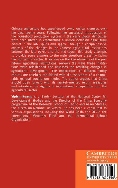 Chinese agriculture has experienced some radical changes over the past twenty years. Following the successful introduction of the household production system in the early 1980s, difficulties were encountered in establishing a unified domestic agricultural market in the later 1980s and 1990s. Through a comprehensive analysis of the changes in the Chinese agricultural institutions between the late 1970s and the mid-1990s, this study attempts to provide some answers to the main questions presently facing the agricultural sector. It focuses on the key elements of the pre-reform agricultural institutions, reviews the ways these institutions were refashioned and assesses the resulting changes in agricultural development. The implications of different policy choices are carefully considered with the assistance of a computable general equilibrium model. The author argues that China should push forward with its market-oriented reform measures and introduce the rigours of international competition into the agricultural sector.