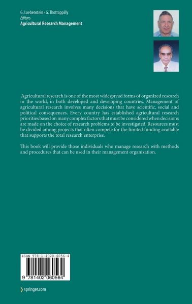 Agricultural research is one of the most widespread forms of organized research in the world, in both developed and developing countries. Management of agricultural research involves many decisions that have scientific, social and political consequences. Every country has established agricultural research priorities based on many complex factors that must be considered when decisions are made on the choice of research problems to be investigated. Resources must be divided among projects that often compete for the limited funding available that supports the total research enterprise. This…mehr