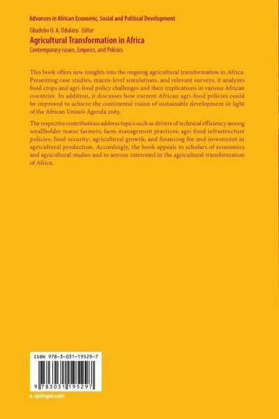 This book offers new insights into the ongoing agricultural transformation in Africa. Presenting case studies, macro-level simulations, and relevant surveys, it analyzes food crops and agri-food policy challenges and their implications in various African countries. In addition, it discusses how current African agri-food policies could be improved to achieve the continental vision of sustainable development in light of the African Union's Agenda 2063.