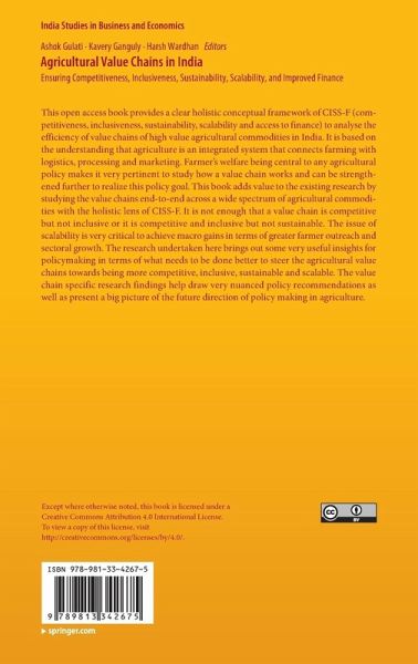 This open access book provides a clear holistic conceptual framework of CISS-F (competitiveness, inclusiveness, sustainability, scalability and access to finance) to analyse the efficiency of value chains of high value agricultural commodities in India. It is based on the understanding that agriculture is an integrated system that connects farming with logistics, processing and marketing. Farmer's welfare being central to any agricultural policy makes it very pertinent to study how a value chain works and can be strengthened further to realize this policy goal. This book adds value to the existing research by studying the value chains end-to-end across a wide spectrum of agricultural commodities with the holistic lens of CISS-F. It is not enough that a value chain is competitive but not inclusive or it is competitive and inclusive but not sustainable. The issue of scalability is very critical to achieve macro gains in terms of greater farmer outreach and sectoral growth. The research undertaken here brings out some very useful insights for policymaking in terms of what needs to be done better to steer the agricultural value chains towards being more competitive, inclusive, sustainable and scalable. The value chain specific research findings help draw very nuanced policy recommendations as well as present a big picture of the future direction of policy making in agriculture.
