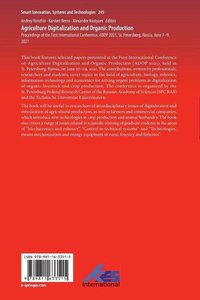 This book features selected papers presented at the First International Conference on Agriculture Digitalization and Organic Production (ADOP 2021), held in St. Petersburg, Russia, on June 07-09, 2021. The contributions, written by professionals, researchers and students, cover topics in the field of agriculture, biology, robotics, information technology and economics for solving urgent problems in digitalization of organic livestock and crop production. The conference is organized by the St. Petersburg Federal Research Center of the Russian Academy of Sciences (SPC RAS) and the Technische…mehr
