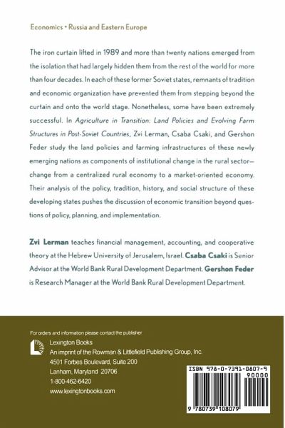 The Iron Curtain lifted in 1989, and more than twenty nations emerged from the isolation that had largely hidden them from the rest of the world for more than four decades. In each of these former Soviet States, remnants of tradition and economic organization has prevented them from stepping out, beyond the curtain and onto the world stage. Regardless, some have been extremely successful. In Agriculture in Transition: Land Policies and Evolving Farm Structures in Post Soviet Countries authors Zvi Lerman, Csaba Csaki, and Gershon Feder study the land policies and farming infastructures of these newly emerging nations as components of institutional change in the rural sector - change from a centralized rural economy to a market-oriented economy. Their analysis of the policy, tradition, history, and social structure of these developing states pushes the discussion of economic transition beyond questions policy, planning, and implementation.