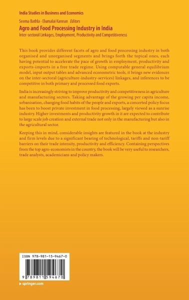This book provides different facets of India's agro and food processing industry in both organised and unorganised segments. It brings forth the topical issues having potential to accelerate the pace of growth in its employment, investment and productivity and strive for improving the global competitiveness. Using advanced quantitative techniques, it brings new evidences on inter-sectoral (agriculture-industry-services) employment and production linkages, contractual arrangements through Farmer Producer Companies, and subcontracting in the processed food sector. It also throws light on India's comparative advantage in export of primary and processed food products.