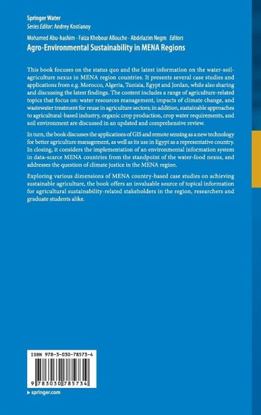 This book focuses on the status quo and the latest information on the water-soil-agriculture nexus in the MENA countries. It presents several case studies and applications from e.g. Morocco, Algeria, Tunisia, Egypt and Jordan, while also sharing and discussing the latest findings. The content includes a range of agriculture-related topics that focus on: water resources management, impacts of climate change, and wastewater treatment for reuse in agriculture sectors; in addition, sustainable approaches to agricultural-based industry, organic crop production, crop water requirements, and soil environment are discussed in an updated and comprehensive review. In turn, the book discusses the applications of GIS and remote sensing as a new technology for better agriculture management, as well as its use in Egypt as a representative country. In closing, it considers the implementation of an environmental information system in data-scarce MENA countries from the standpoint of the water-food nexus, and addresses the question of climate justice in the MENA region.