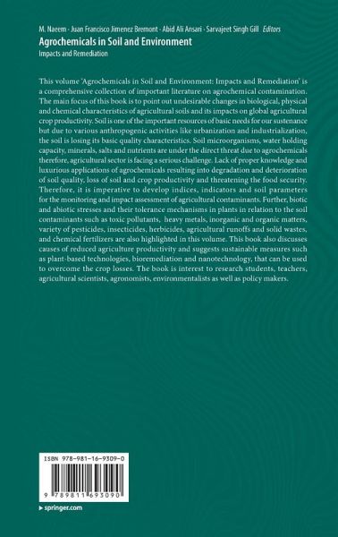 Chapter 1. Agrochemicals in Soil and Environment: An Overview.- Chapter 2. Agrochemicals- Provenance, Environmental Fate and Remediation Measures.- Chapter 3. Impact of Agrochemicals on Soil Microbiota.- Chapter 4. Agriculture Pollution in Kerala, India with Special Reference to Endosulphan.- Chapter 5. An Intergenerational Community-Based Approach to Safe Farming and Environmental Health.- Chapter 6. Guidance on Pesticides Handling in Farming.- Chapter 7. Impact of Pesticides, Herbicides and Insecticides on the Ecosystem.- Chapter 8. Pesticides and its Effects on Plants: A Case Study of Deltamethrin.- Chapter 9. The Use of Glyphosate in Regions of Argentina and Colombia and its Socio-environmental Impacts.- Chapter 10. Impact of Insecticides on Soil and Environment and their Management Strategies.- Chapter 11. Role of Insect Pest Management in Agriculture Conservation.- Chapter 12. Mobility of Trace Elements in Agricultural Soils- Chapter 13. The effects of nutrient enrichment on nutrient-poor ecosystems: Insights from the study of serpentine soil plant relations.- Chapter 14. Soil Erosion and Sedimentation - A Source of Contamination and Impact on Agriculture Productivity.- Chapter 15. Plastics in the Soil Environment: An Overview.- Chapter 16. Lead and cadmium contamination in the soil environment: Impacts on plant growth and human health.- Chapter 17. Heavy metals contamination on farmlands in the crude oil exploration area.- Chapter 18. Effect of Trace Elements in Soils and Its Management.- Chapter 19. Remediation of Agrochemicals in Soil and Environment.- Chapter 20. Alleviation in the Toxicity of Heavy Metals on Agricultural Crops by Metal Resistant Bacteria.- Chapter 21. Bioremediation Strategies to Mitigate the Impact of Atrazine in the Environment: Recent Advances and Prospects. Chapter 22. Aspergillus Mediated Bioremediation of Agrochemicals- Current Progress and Future Perspectives.- Chapter 23. Implications of Phytohormones as Agro-chemicals under Dynamic Environmental Conditions.- Chapter 24. Role of Genetically Modified Bacteria for Alleviating of Agrochemical Impact on the Environment.- Chapter 25. 'Omics Perspective' - Molecular Blue-print for Agrochemical Remediation.- Chapter 26. Impact and Remediation of Agrochemicals in Soil and Environment: Conclusions and Future Perspectives.