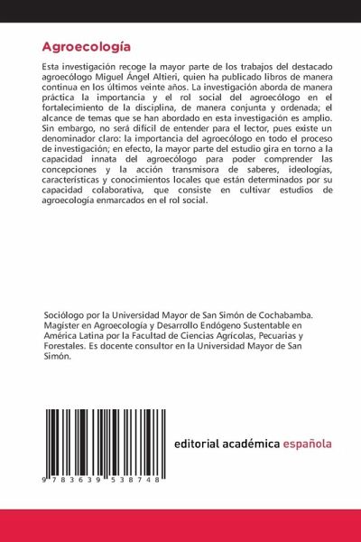 Esta investigación recoge la mayor parte de los trabajos del destacado agroecólogo Miguel Ángel Altieri, quien ha publicado libros de manera continua en los últimos veinte años. La investigación aborda de manera práctica la importancia y el rol social del agroecólogo en el fortalecimiento de la disciplina, de manera conjunta y ordenada; el alcance de temas que se han abordado en esta investigación es amplio. Sin embargo, no será difícil de entender para el lector, pues existe un denominador claro: la importancia del agroecólogo en todo el proceso de investigación; en efecto, la mayor parte del estudio gira en torno a la capacidad innata del agroecólogo para poder comprender las concepciones y la acción transmisora ¿¿de saberes, ideologías, características y conocimientos locales que están determinados por su capacidad colaborativa, que consiste en cultivar estudios de agroecología enmarcados en el rol social.