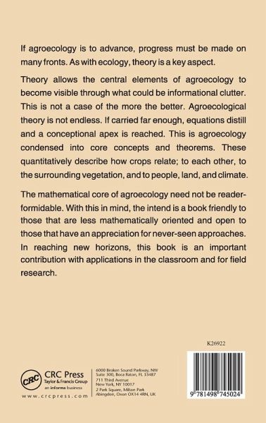 Agroecology theory is not endless. A point is reached where the central elements become visible, equations distill, and a conceptual apex is reached. This is agroecology condensed into core concepts and theorems describing how crops relate to each other, the land, and their surroundings. This book covers advanced agroecology, including agroecological theory as well as applications of biodiversity that underwrite agroecology. Since much of agroecology theory is new, the resulting algorithms are equally novel, though presented so as to be useful and appreciated by less mathematically inclined professionals.