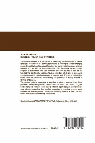 Science in agroforestry.- Agroforestry policy issues and research directions in the US and less developed countries: insights and challenges from recent experience.- Economic evaluation of financial and non-financial costs and benefits in agroforestry development and the value of sustainability.- Farmer costs and benefits from agroforestry and farm forestry projects in Central America and the Caribbean: implications for policy.- Contribution of agroforestry trees to nutrient requirements of intercropped plants.- Tree root characteristics as criteria for species selection and systems design in agroforestry.- Soil amelioration and root symbioses of Parkia biglobosa (Jacq.) Benth. in West Africa.- Root architecture in relation to tree-soil-crop interactions and shoot pruning in agroforestry.- A model simulating above- and below-ground tree architecture with agroforestry applications.- The tree-crop interface: representation by coupling of forest and crop process-models.- A framework for a modular modelling approach for agroforestry.- Incorporation of indigenous knowledge and perspectives in agroforestry development. Part 1: Review of methods and their application.- Incorporation of indigenous knowledge and perspectives in agroforestry development. Part 2: Case-study on the impact of explicit representation of farmers' knowledge.- The use and value of multiple methods to capture the diversity of endogenous agroforestry knowledge: an example from Rwanda.- Historical development of agroforestry in China.