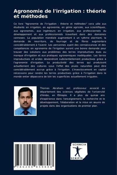 Ce livre "Agronomie de l'irrigation : théorie et méthodes" sera utile aux étudiants en irrigation, en agronomie, en génie agricole, aux scientifiques, aux agronomes, aux ingénieurs en irrigation, aux professionnels du développement et aux professionnels travaillant dans des domaines connexes. La population mondiale augmentant à un rythme alarmant, la demande de nourriture, de fourrage et de fibres augmentera considérablement à l'avenir. Les personnes ayant des connaissances et des compétences en agronomie de l'irrigation auront une bonne demande pour trouver des solutions aux problèmes des terres improductives dues au manque d'irrigation et aux pratiques agronomiques inadéquates. Les terres improductives et arides deviendront substantiellement productives grâce à l'agronomie d'irrigation. La productivité des terres qui produisent actuellement des cultures sous l'effet des pluies naturelles peut être considérablement accrue grâce à l'irrigation. L'investissement en capital nécessaire pour rendre les terres productives grâce à l'irrigation dans le monde entier dépassera de loin les superficies actuellement irriguées.