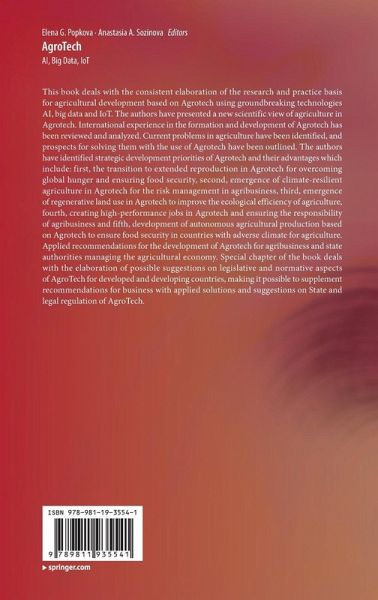 This book deals with the consistent elaboration of the research and practice basis for agricultural development based on Agrotech using groundbreaking technologies AI, big data and IoT. The authors have presented a new scientific view of agriculture in Agrotech. International experience in the formation and development of Agrotech has been reviewed and analyzed. Current problems in agriculture have been identified, and prospects for solving them with the use of Agrotech have been outlined. The authors have identified strategic development priorities of Agrotech and their advantages which include: first, the transition to extended reproduction in Agrotech for overcoming global hunger and ensuring food security, second, emergence of climate-resilient agriculture in Agrotech for the risk management in agribusiness, third, emergence of regenerative land use in Agrotech to improve the ecological efficiency of agriculture, fourth, creating high-performance jobs in Agrotech and ensuring the responsibility of agribusiness and fifth, development of autonomous agricultural production based on Agrotech to ensure food security in countries with adverse climate for agriculture. Applied recommendations for the development of Agrotech for agribusiness and state authorities managing the agricultural economy. Special chapter of the book deals with the elaboration of possible suggestions on legislative and normative aspects of AgroTech for developed and developing countries, making it possible to supplement recommendations for business with applied solutions and suggestions on State and legal regulation of AgroTech.