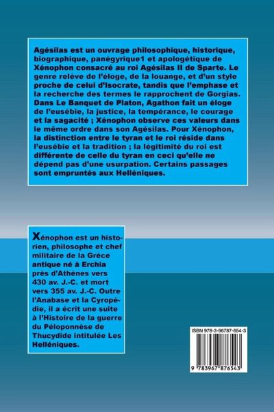 Agésilas est un ouvrage philosophique, historique, biographique, panégyrique1 et apologétique de Xénophon consacré au roi Agésilas II de Sparte. Le genre relève de l'éloge, de la louange, et d'un style proche de celui d'Isocrate, tandis que l'emphase et la recherche des termes le rapprochent de Gorgias. Dans Le Banquet de Platon, Agathon fait un éloge de l'eusébie, la justice, la tempérance, le courage et la sagacité ; Xénophon observe ces valeurs dans le même ordre dans son Agésilas. Pour Xénophon, la distinction entre le tyran et le roi réside dans l'eusébie et la tradition ; la légitimité du roi est différente de celle du tyran en ceci qu'elle ne dépend pas d'une usurpation. Certains passages sont empruntés aux Helléniques.