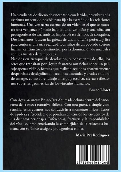 Estos relatos transitan entre recuerdos e imaginarios de balnearios, costas, montañas y poblados que buscan hablar con otros territorios y épocas. Los escenarios explorados en Aguas de marzo intersectan el espacio rural como lugar de enunciación y las posibilidades narrativas. Aguas de marzo es el primer libro de Bruno Jara e incluye una nouvelle escrita en tono personal y cuatro cuentos que van a atraer al lector gracias al mundo que construye a través de las vivencias de sus personajes y los paisajes que los rodean.