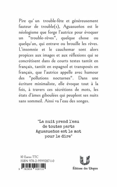 Pire qu'un trouble-fête et généreusement fauteur de trouble(s), Aguasueños est le néologisme que forge l'autrice pour évoquer un "trouble-rêves", quelque chose ou quelqu'un, qui entrave ou brouille les rêves. L'insomnie et le cauchemar sont alors propices aux images et aux réflexions qui se concrétisent dans de courts textes tantôt en français, tantôt en espagnol et transposés en français, que l'autrice appelle avec humour des "pollutions nocturnes". Dans une écriture minimaliste, elle évoque tout à la fois, à travers ces sécrétions de mots, les états d'âmes giboulées qui peuplent ses nuits sans sommeil. Ainsi va l'eau des songes.