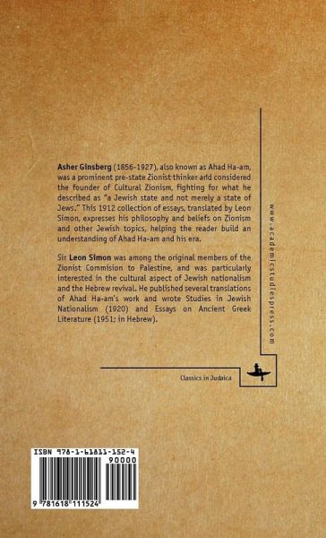 Asher Ginsberg (1856-1927), also known as Ahad Ha-Am, was a prominent pre-state Zionist thinker and considered the founder of Cultural Zionism, fighting for what he described as "a Jewish state and not merely a state of Jews." This 1912 collection of essays, translated by Leon Simon, expresses his philosophy and beliefs on Zionism and other Jewish topics, helping the reader build an understanding of Ahad Ha-Am and his era.