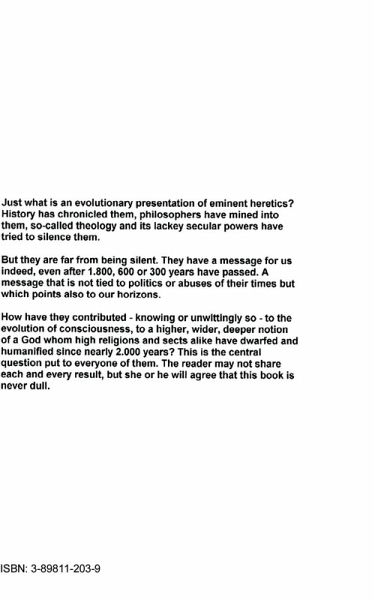 Just what is an evolutionary presentation of eminent heretics? History has chronicled them, philosophers have mined into them, so-called theology and its lackey secular power have tried to silence them. Buy they are far from being silent. They have a message for us indeed, even after 1.800, 600 or 300 years have passed. A message that is not tied to politics or abuses of their times but which points also to our horizons. How have they contributed - knowing or unwittingly so - to the evolution of consciousness, to a higher, wider, deeper notion of a God whom high religions and sects alike have dwarfed and humanifled since nearly 2.000 years? This its the central question put to everyone of them. The reader may not share each and every result, but she or he will agree that this book is never dull.