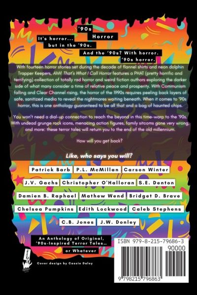 With fourteen horror stories set during the decade of flannel shirts and neon dolphin Trapper Keepers, Ahh! That's What I Call Horror features a PHAT (pretty horrific and terrifying) collection of totally rad horror and weird fiction authors exploring the darker side of what many consider a time of relative peace and prosperity. With Communism falling and Clear Channel rising, the horror of the 1990s requires peeling back layers of safe, sanitized media to reveal the nightmares waiting beneath. When it comes to '90s horror, this is one anthology guaranteed to be all that and a bag of haunted chips. You won't need a dial-up connection to reach the beyond in this time-warp to the '90s. With undead grunge rock icons, menacing action figures, family sitcoms gone very wrong, and more: these terror tales will return you to the end of the old millennium. How will you get back? Like, who says you will?