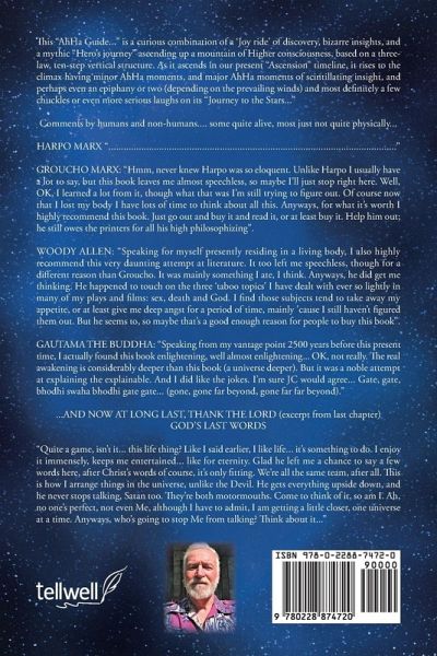 This "AhHa Guide..." is a curious combination of a 'Joy ride' of discovery, bizarre insights, and a mythic "Hero's journey" ascending up a mountain of Higher consciousness, based on a three law ten step vertical structure. As it ascends in our present "Ascension" timeline, it rises to the climax having minor AhHa moments, and major AhHa moments of scintillating insight, and perhaps even an epiphany or two (depending on the prevailing winds)and most definitely a few chuckles or even more serious laughs on its "Journey to the Stars..." Comments by humans and non-humans.... some quite alive most just not quite physically... HARPO MARX ".................................................................................................................." GROUCHO MARX..."Hmm never knew Harpo was so eloquent. Unlike Harpo I usually have a lot to say but this book leaves me almost speechless, so maybe I'll just stop right here. Well Ok I learned a lot from it, though what that was I'm still trying to figure out. Of course now that I lost my body I have lots of time to think about all this. Anyways for what it's worth I highly recommend this book. Just go out and buy it and read it or at least buy it. Help him out he still owes the printers for all his high philosophizing". WOODY ALLEN...."Speaking for myself presently residing in a living body, I also highly recommend this very daunting attempt at literature. It too left me speechless though for a different reason than Groucho. It was mainly something I ate I think. Anyways he did get me thinking. He happened to touch on the three 'taboo topics' I have dealt with ever so lightly in many of my plays and films...." Sex.... Death and God". I find those subjects tend to take away my appetite, or at least give me deep angst for a period of time, mainly cause I still haven't figured them out. But he seems to, so maybe that's a good enough reason for people to buy this book". GAUTAMA THE BUDDHA .... "Speaking from my vantage point 2500 years before this present time, I actually found this book enlightening, well almost enlightening... ok not really. The real awakening is considerably deeper than this book (a universe deeper). But it was a noble attempt at explaining the explainable. And I did like the jokes. I'm sure JC would agree... Gate, gate, bhodhi swaha bhodhi gate gate... (gone, gone far beyond, gone far far beyond) ...AND NOW AT LONG LAST THANK THE LORD (excerpt from last chapter) GOD'S LAST WORDS "Quite a game isn't it... this life thing? Like I said earlier I like life.. it's something to do. I enjoy it immensely, keeps me entertained... like for eternity. Glad he left me a chance to say a few words here, after Christ's words of course, its only fitting. We're all the same team after-all. This is how I arrange things in the universe unlike the Devil he's gets everything upside down, and he never stops talking, Satan too. They're both motor mouths.... come to think of it so am I. Ah.. no ones perfect not even Me, although I have to admit, I am getting a little closer one universe at a time... anyways whose going to stop Me from talking?... think about it..."