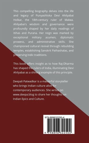 Ahilyabai Holkar: The Guardian of Indic Civilization In this compelling biography, Deepali Patwadkar delves into the life and legacy of Punyashloka Devi Ahilyabai Holkar, the 18th-century ruler of Malwa. Ahilyabai's wisdom and governance were profoundly shaped by her daily readings of the Itihas and Purana. Her reign was marked by exceptional military acumen, diplomatic prowess, and administrative skills. She championed cultural revival through extensive temple building, establishing Sanskrit Pathashalas, and preserving Indic traditions. Her just and compassionate leadership offers timeless lessons in governance, cultural stewardship, and social responsibility. This book offers insight into how Raj-Dharma has shaped India's kings and queens, and highlights how Devi Ahilyabai was a beacon of that principle.