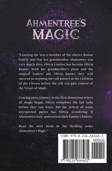 Learning she was a member of the elusive Romar family and that her grandmother Ahmentree was very much alive, Olivia London has become Olivia Romar. With her grandmother's plans and the magical leaders' aid, Olivia knows they will succeed in stopping the cult known as the Children of the Chosen before the cult can gain control of the Vessel of Magic. Gearing up to journey to the first dimension where all magic began, Olivia completes the last tasks before they can leave. But the arrival of some unexpected guests has Olivia wondering if Ahmentree truly understood their family's history. Read the next book in the thrilling series Ahmentree's Magic.