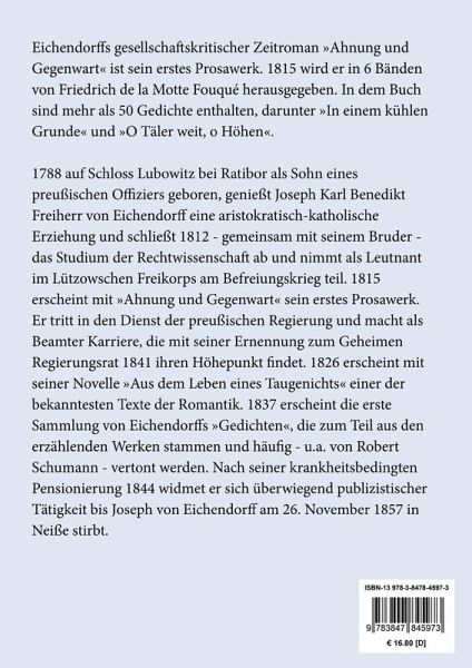 Joseph von Eichendorff: Ahnung und Gegenwart Lesefreundlicher Großdruck in 16-pt-Schrift Eichendorffs gesellschaftskritischer Zeitroman »Ahnung und Gegenwart« ist sein erstes Prosawerk. 1815 wird er in 6 Bänden von Friedrich de la Motte Fouqué herausgegeben. In dem Buch sind mehr als 50 Gedichte enthalten, darunter »In einem kühlen Grunde« und »O Täler weit, o Höhen«. Großformat, 210 x 297 mm Berliner Ausgabe, 2020 Durchgesehener Neusatz mit einer Biographie des Autors bearbeitet und eingerichtet von Theodor Borken Erstdruck: Nürnberg (J. L. Schrag) 1815. Textgrundlage ist die Ausgabe: Joseph von Eichendorff: Werke. Nach den Ausgaben letzter Hand unter Hinzuziehung der Erstdrucke herausgegeben von Ansgar Hillach, Bd. 1¿3, München: Winkler, 1970 ff. Umschlaggestaltung von Thomas Schultz-Overhage unter Verwendung des Bildes: Carl Blechen, Das Kloster Santa Scolastica, 1832. Gesetzt aus der Minion Pro, 16 pt. Henricus Edition Deutsche Klassik UG (haftungsbeschränkt) Über den Autor: 1788 auf Schloss Lubowitz bei Ratibor als Sohn eines preußischen Offiziers geboren, genießt Joseph Karl Benedikt Freiherr von Eichendorff eine aristokratisch-katholische Erziehung und schließt 1812 - gemeinsam mit seinem Bruder - das Studium der Rechtwissenschaft ab und nimmt als Leutnant im Lützowschen Freikorps am Befreiungskrieg teil. 1815 erscheint mit »Ahnung und Gegenwart« sein erstes Prosawerk. Er tritt in den Dienst der preußischen Regierung und macht als Beamter Karriere, die mit seiner Ernennung zum Geheimen Regierungsrat 1841 ihren Höhepunkt findet. 1826 erscheint mit seiner Novelle »Aus dem Leben eines Taugenichts« einer der bekanntesten Texte der Romantik. 1837 erscheint die erste Sammlung von Eichendorffs »Gedichten«, die zum Teil aus den erzählenden Werken stammen und häufig - u.a. von Robert Schumann - vertont werden. Nach seiner krankheitsbedingten Pensionierung 1844 widmet er sich überwiegend publizistischer Tätigkeit bis Joseph von Eichendorff am 26. November 1857 in Neiße stirbt.
