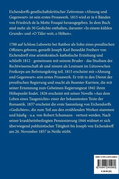 Joseph von Eichendorff: Ahnung und Gegenwart Lesefreundlicher Großdruck in 16-pt-Schrift Eichendorffs gesellschaftskritischer Zeitroman »Ahnung und Gegenwart« ist sein erstes Prosawerk. 1815 wird er in 6 Bänden von Friedrich de la Motte Fouqué herausgegeben. In dem Buch sind mehr als 50 Gedichte enthalten, darunter »In einem kühlen Grunde« und »O Täler weit, o Höhen«. Großformat, 210 x 297 mm Berliner Ausgabe, 2020 Durchgesehener Neusatz mit einer Biographie des Autors bearbeitet und eingerichtet von Theodor Borken Erstdruck: Nürnberg (J. L. Schrag) 1815. Textgrundlage ist die Ausgabe: Joseph von Eichendorff: Werke. Nach den Ausgaben letzter Hand unter Hinzuziehung der Erstdrucke herausgegeben von Ansgar Hillach, Bd. 1¿3, München: Winkler, 1970 ff. Umschlaggestaltung von Thomas Schultz-Overhage unter Verwendung des Bildes: Carl Blechen, Das Kloster Santa Scolastica, 1832. Gesetzt aus der Minion Pro, 16 pt. Über den Autor: 1788 auf Schloss Lubowitz bei Ratibor als Sohn eines preußischen Offiziers geboren, genießt Joseph Karl Benedikt Freiherr von Eichendorff eine aristokratisch-katholische Erziehung und schließt 1812 - gemeinsam mit seinem Bruder - das Studium der Rechtwissenschaft ab und nimmt als Leutnant im Lützowschen Freikorps am Befreiungskrieg teil. 1815 erscheint mit »Ahnung und Gegenwart« sein erstes Prosawerk. Er tritt in den Dienst der preußischen Regierung und macht als Beamter Karriere, die mit seiner Ernennung zum Geheimen Regierungsrat 1841 ihren Höhepunkt findet. 1826 erscheint mit seiner Novelle »Aus dem Leben eines Taugenichts« einer der bekanntesten Texte der Romantik. 1837 erscheint die erste Sammlung von Eichendorffs »Gedichten«, die zum Teil aus den erzählenden Werken stammen und häufig - u.a. von Robert Schumann - vertont werden. Nach seiner krankheitsbedingten Pensionierung 1844 widmet er sich überwiegend publizistischer Tätigkeit bis Joseph von Eichendorff am 26. November 1857 in Neiße stirbt.
