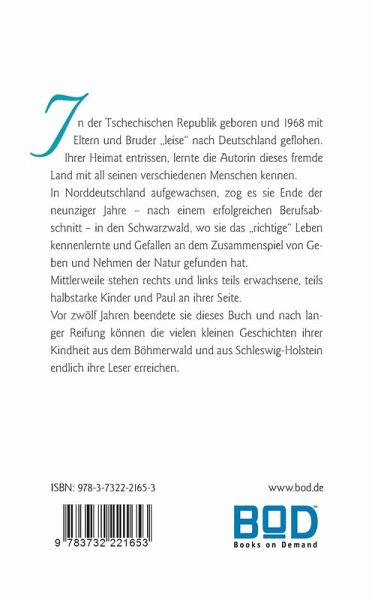 In der Tschechischen Republik geboren und 1968 mit Eltern und Bruder "leise" nach Deutschland geflohen. Ihrer Heimat entrissen, lernte die Autorin dieses fremde Land mit all seinen verschiedenen Menschen kennen.In Norddeutschland aufgewachsen, zog es sie Ende der neunziger Jahre - nach einem erfolgreichen Berufsabschnitt- in den Schwarzwald, wo sie das "richtige" Leben kennenlernte und Gefallen an dem Zusammenspiel von Geben und Nehmen der Natur gefunden hat.Mittlerweile stehen rechts und links teils erwachsene, teils halbstarke Kinder und Paul an ihrer Seite. Vor zwölf Jahren beendete sie dieses Buch und nach langer Reifung können die vielen kleinen Geschichten ihrer Kindheit aus dem Böhmerwald und aus Schleswig-Holstein endlich ihre Leser erreichen.