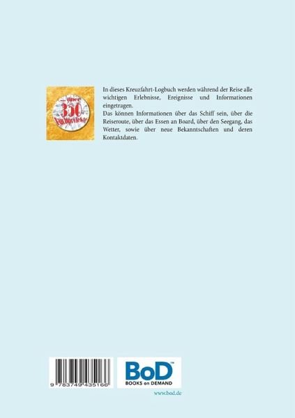 In dieses Kreuzfahrt-Logbuch werden während der Reise alle wichtigen Erlebnisse, Ereignisse und Informationen eingetragen.Das können Informationen über das Schiff sein, über die Reiseroute, über das Essen an Board, über den Seegang, das Wetter, sowie über neue Bekanntschaften und deren Kontaktdaten.