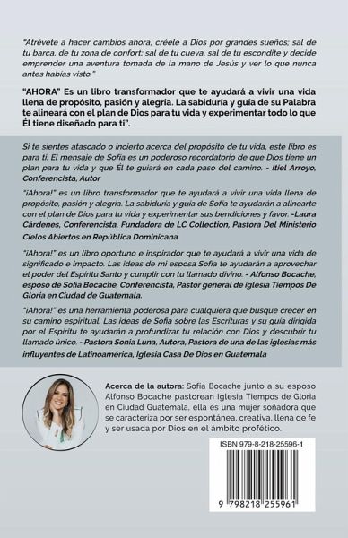 En "¡AHORA! Camina en el cumplimiento de Tu propósito Hoy" de Sofía Bocache, nos presenta un viaje espiritual revelador hacia la realización del propósito divino en nuestras vidas. A través de diez capítulos con mensajes profundos y conmovedores, la autora nos guía hacia una comprensión más profunda de cómo abrazar el plan que Dios ha trazado para cada uno de nosotros. En el prólogo, Sofía comparte sus propias experiencias de transformación y crecimiento espiritual, destacando la importancia de reconocer que los cambios significativos comienzan desde adentro. Con un estilo cálido y accesible, invita a los lectores a embarcarse en un viaje de autodescubrimiento y entrega a Dios. Cada capítulo aborda temas fundamentales como el disfrute del presente, cómo soltar el control, la importancia de ver lo que a menudo pasamos por alto y la creencia en el poder ilimitado de Dios para realizar lo que parece imposible. A través de historias inspiradoras y pasajes bíblicos, Sofía nos desafía a vivir con alegría, gratitud y fe en cada paso de nuestro camino. En "¡AHORA!", los lectores encontrarán las herramientas espirituales necesarias para abrazar su propósito con valentía y determinación. Sofía Bocache nos recuerda que, como Simeón y María quedaron maravillados al abrazar el propósito divino de Jesús, también podemos encontrar asombro y satisfacción al vivir nuestra vida con propósito y significado. Este libro es una guía espiritual conmovedora y práctica para aquellos que buscan una conexión más profunda con Dios y el cumplimiento de su propósito divino en el presente. Sofía Bocache nos impulsa a confiar en Su plan y vivir en la plenitud de Su propósito.