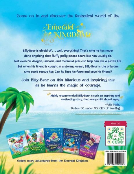 Mom's Choice Awards Gold Winner Golden Wizard Book Prize Winner "Highly recommended! Billy-Bear is such an inspiring and motivating story, that every child should enjoy." -Felix Haffa, Forbes 30 under 30, CEO of NewFlag "There is so much to love about Pirate Billy-Bear...My youngest reader absolutely adored the language...Very highly recommended." - Readers' Favorite, 5 stars Come on in and discover the award-winning and hilarious world of the Emerald Kingdom! Billy-Bear is afraid of . . . well, everything! That's why he has never done anything that fluffy-puffy pirate bears like him usually do. Not even his dragon, unicorn, and mermaid pals can help him live a pirate life. But when his friend is caught in a stormy ocean, Billy-Bear is the only one who could rescue her. Can he face his fears and save his friend? Join Billy-Bear on this hilarious and inspiring tale as he learns the magic of courage. "Highly recommended! Billy-Bear is such an inspiring and motivating story, that every child should enjoy." -Felix Haffa, Forbes 30 under 30, CEO of NewFlag