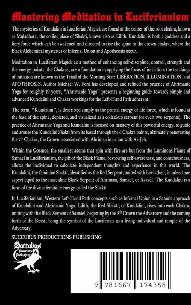 MASTERING YOGA IN LUCIFERIANISM The mysteries of Kundalini in Luciferian Magick are found at the center of the root chakra, known as Muladhara, the coiling place of Shakti, known also as Lilith. Kundalini is both a goddess and a fiery force which can be awakened and directed to rise the spine to the crown chakra, where the Black Alchemical mysteries of Infernal Union and Apotheosis occur. Meditation in Luciferian Magick as a method of enhancing self-discipline, control, strength and the energy-points, the Chakras, are a foundation in applying the focus of initiation: the teachings of initiation are known as the Triad of the Morning Star: LIBERATION, ILLUMINATION, and APOTHEOSIS. Author Michael W. Ford has developed and refined the practice of Ahrimanic Yoga for roughly 19 years, "Ahrimanic Yoga" presents a beginning guide towards simple and advanced Kundalini and Chakra workings for the Left-Hand Path adherent. The term, "Kundalini", is described simply as the primal energy or life force, which is found at the base of the spine, depicted, and visualized as a coiled-up serpent (or even two serpents). The practice of Ahrimanic Yoga and Kundalini is focused on mastery of this powerful energy, to guide and arouse the Kundalini Shakti from its based through the 6 Chakra points, ultimately penetrating the 7th Chakra, the Crown, associated with Ahriman in union with Az-Jeh. Within the Cosmos, the smallest atoms that spin with fire are but from the Luminous Flame of Samael in Luciferianism, the gift of the Black Flame, bestowing self-awareness, and consciousness, allows the individual to calculate independent thoughts and experience in this world. The Kundalini, the feminine Shakti, identified as the Red Serpent, united with Leviathan, is indeed one aspect equal to the masculine Black Serpent of Ahriman, Samael, or Azazel. The Kundalini is a form of the divine feminine energy called the Shakti. In Luciferianism, Western Left-Hand Path concepts such as Infernal Union is a Satanic approach of Kundalini and Ahrimanic Yoga. Lilith, the Red Shakti, or Kundalini, rises into each Chakra, uniting with the Black Serpent of Samael, begetting by the 8th Crown the Adversary and the coming forth of the Beast, being the symbol of the Luciferian as a living individual and temple of the Adversary.
