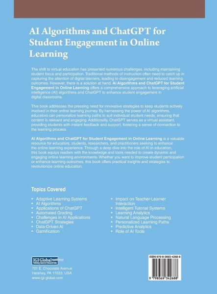 The shift to virtual education has presented numerous challenges, including maintaining student focus and participation. Traditional methods of instruction often need to catch up in capturing the attention of digital learners, leading to disengagement and reduced learning outcomes. However, there is a solution at hand. AI Algorithms and ChatGPT for Student Engagement in Online Learning offers a comprehensive approach to leveraging artificial intelligence (AI) algorithms and ChatGPT to enhance student engagement in digital classrooms. This book addresses the pressing need for innovative strategies to keep students actively involved in their online learning journey. By harnessing the power of AI algorithms, educators can personalize learning paths to suit individual student needs, ensuring that content is relevant and engaging. Additionally, ChatGPT serves as a virtual assistant, providing students with instant feedback and support, fostering a sense of connection to the learning process.