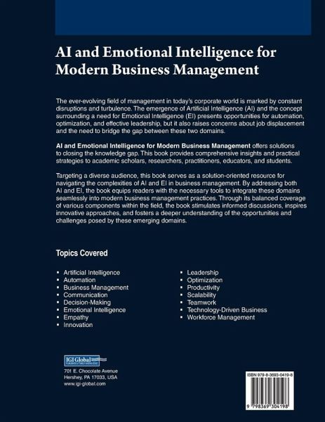 The ever-evolving field of management in today's corporate world is marked by constant disruptions and turbulence. The emergence of Artificial Intelligence (AI) and Emotional Intelligence (EI) presents opportunities for automation, optimization, and effective leadership, but it also raises concerns about job displacement and the need to bridge the gap between these two domains. AI and Emotional Intelligence for Modern Business Management: Bridging the Gap and Nurturing Success offers solutions to closing the knowledge gap. This book provides comprehensive insights and practical strategies to academic scholars, researchers, practitioners, educators, and students. Targeting a diverse audience, this book serves as a solution-oriented resource for navigating the complexities of AI and EI in business management. By addressing both AI and EI, the book equips readers with the necessary tools to integrate these domains seamlessly into modern business management practices, stimulating informed discussions, inspiring innovative approaches, and fostering a deeper understanding of the opportunities and challenges posed by these emerging fields.