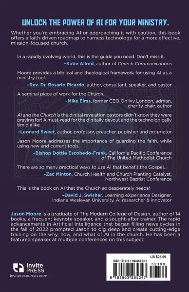 As artificial intelligence continues to reshape industries, communities, and personal lives, the church stands at a critical crossroads. How should we respond to this transformative technology? What role can AI play in ministry, and what are the ethical boundaries we must respect? AI and the Church by Jason Moore tackles these questions head-on, offering church leaders a thoughtful, practical, and faith-driven roadmap. This book provides an in-depth look at AI, from its basic concepts and history to the cutting-edge tools available today. But AI and the Church is more than just a technology guide; it's a call to action. Moore challenges readers to see AI not as a threat, but as a tool that, when used wisely, can enhance the church's mission in powerful ways. Explore how AI can streamline administrative tasks, help craft sermons, and even create immersive worship experiences. At the same time, Moore addresses the ethical concerns and biblical principles that must guide the church's approach. Whether you're excited about AI, cautious, or even opposed to its use, this book invites you to engage with this technology thoughtfully and courageously. With a blend of practical advice, theological reflection, and real-world examples, AI and the Church is the definitive guide for pastors and church leaders who want to lead their congregations into the future with wisdom and integrity.